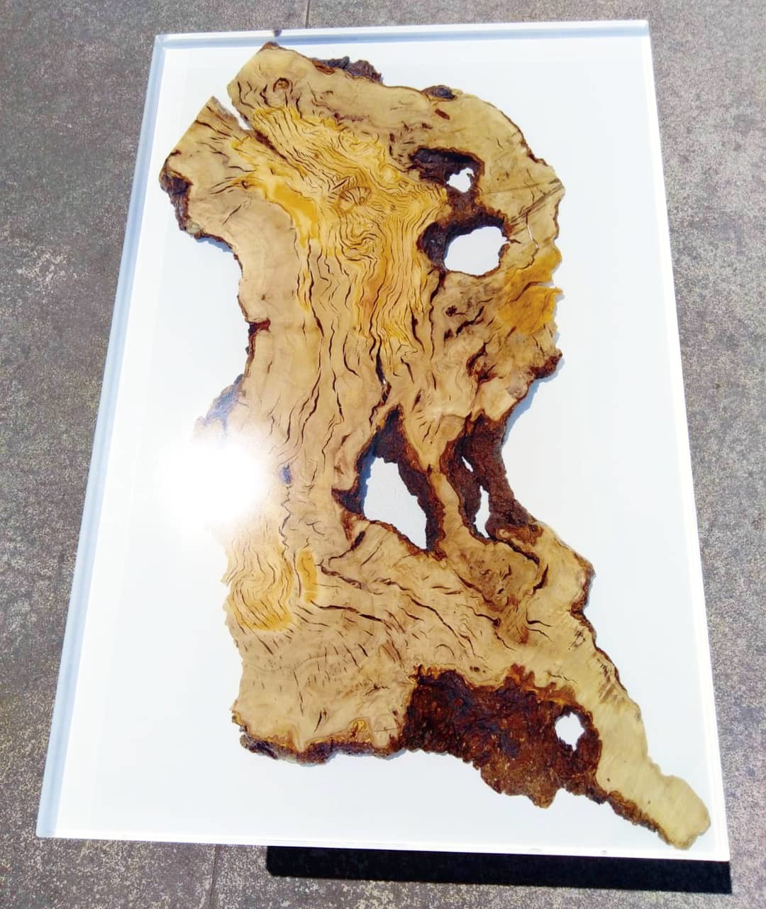 A beautiful olive root board embedded in transparent epoxy.