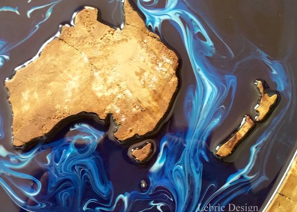 Tavolo rotondo irregolare con planisfero intagliato con tecnica del "wood tattoo". Resina con sfumature blu e azzurre. Diametro circa 1 metro.
