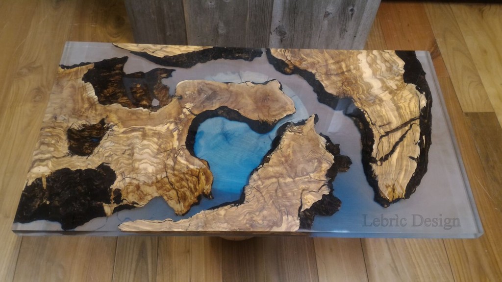 Questo originale tavolino da salotto è stato realizzato mettendo insieme diversi elementi in radica di ulivo inglobati nella resina. C’è inoltre una lieve sfumatura azzurra che contribuisce a rimandare l’immagine dei fiordi delle scogliere di Stoccolma.